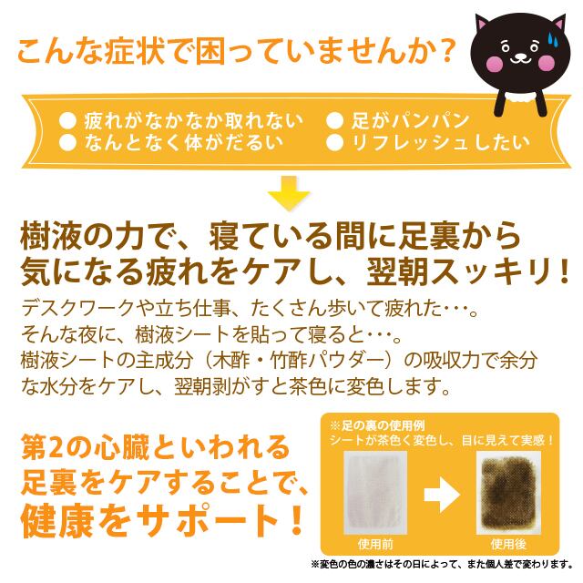樹液シートの主成分(木酢・竹酢パウダー)の吸収力で余分な水分を吸ってくれますので、翌朝剥がすとシートが茶色に変色します。