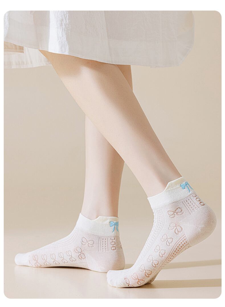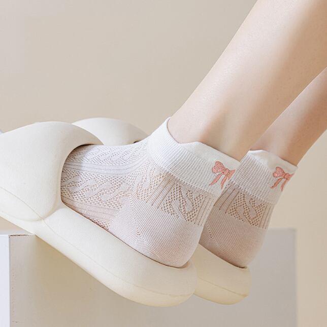 靴下 レディース ソックス 通気性 伸縮 5足セット メッシュ りぼん 刺繍 リボン 可愛い フェミニン 5足組