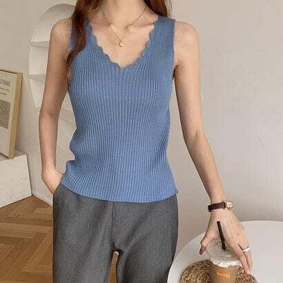 デイリーコーデに重宝するベーシックなデザインのタンクトップ。 ざっくり開いたVネックスカラップを施して、フェミニンで可愛らしいデザインです。 さらりとしたサマーニット素材なので、汗ばむ季節も快適に過ごせます◎ 一枚でもインナーとしても着回し力の高さが魅力の万能アイテムです♪ 素材:(本体)ポリエステル:100% 生産国:中国 サイズ詳細(CM) [F]着丈:52cm身幅:56~90cm ※測り方によって若干の誤差が生じる場合がございます。 伸縮性のある商品の性質上、多少の個体差がございます。 ご了承の上お買い求め下さい。 この商品はサンプルでの撮影を行っています。 実際の商品の仕様、イメージ、サイズ、品質表示、原産国等が異なる場合がございます。 商品によってシワ・折り目・多少の糸のほつれ・裁断上のズレなどが?