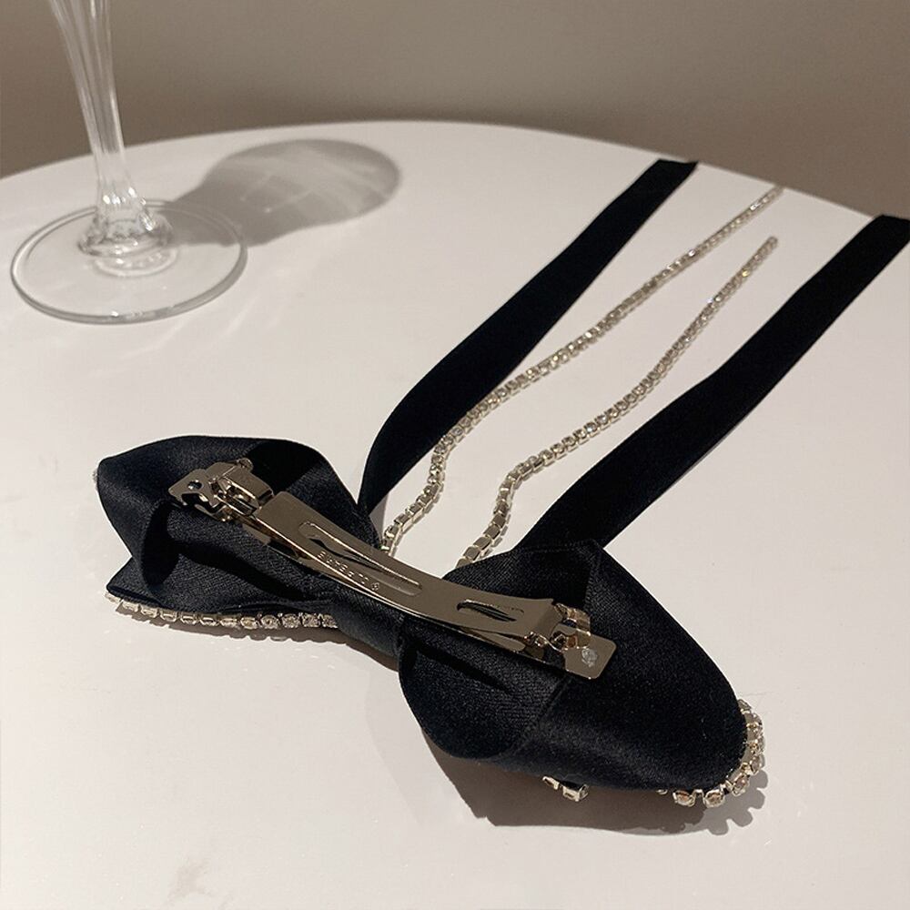 ダブル蝶々リボンにきらきら輝くラインストーンチェーンを加えたフェミニンな雰囲気のヘアバレッタ