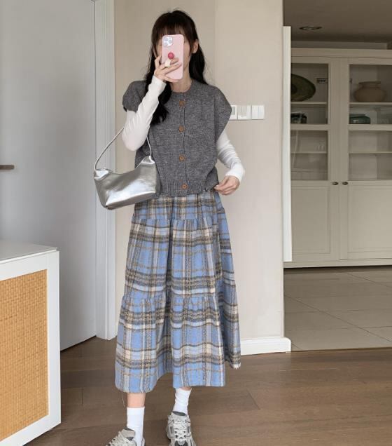 2024秋冬新作 ボトムス 女 レディース ハイウエスト チェック柄 ロングスカート 台型スカート