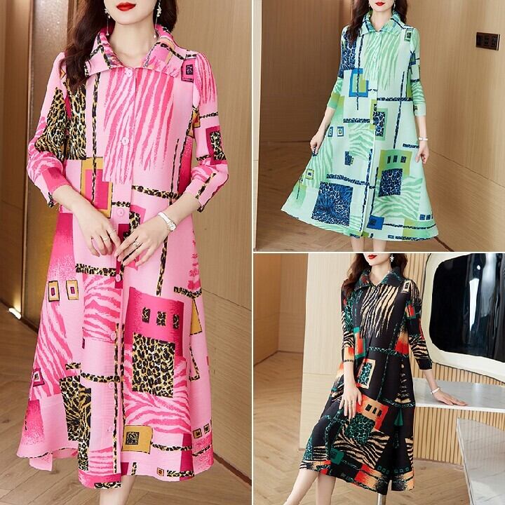 無料 新作レディースファッション カジュアル プリント シャツ風 プリーツ ワンピース